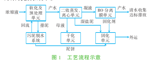 浓缩液全量化处理的工艺流程见图1,强制循环二效蒸发是全量化处理工艺流程中的核心单元。